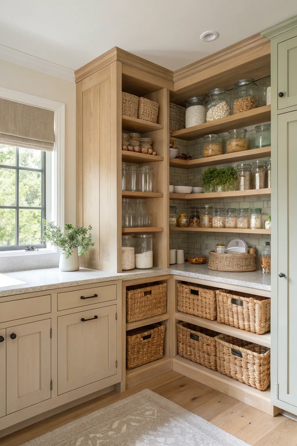 - Wooden Corner Shelving Unit: Maximize your space with a stylish wooden corner shelving unit for efficient pantry organization.