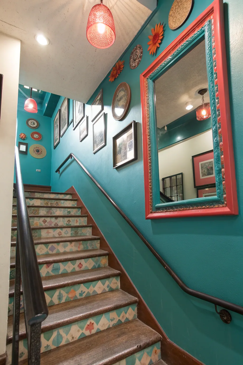 Expand your stairwell’s visual space with a strategically placed mirror that reflects light beautifully.