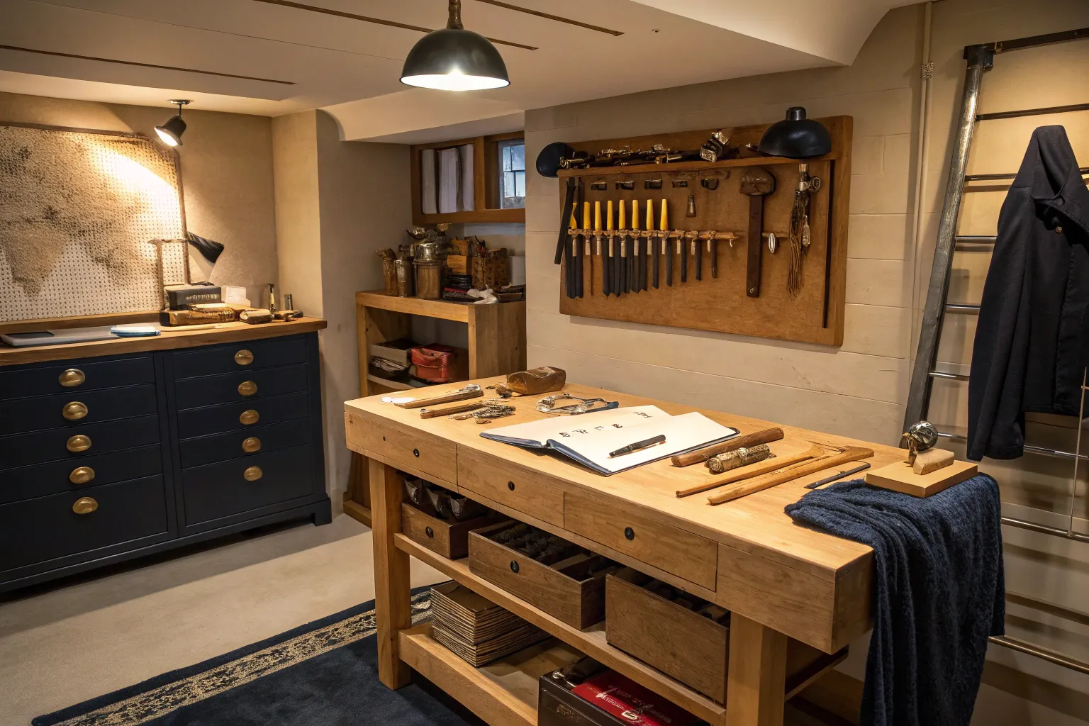 Dedicate a section of wall space to inspiration—whether it’s a pinboard of ideas or a chalkboard for sketches. It’s where dreams begin in my workshop.