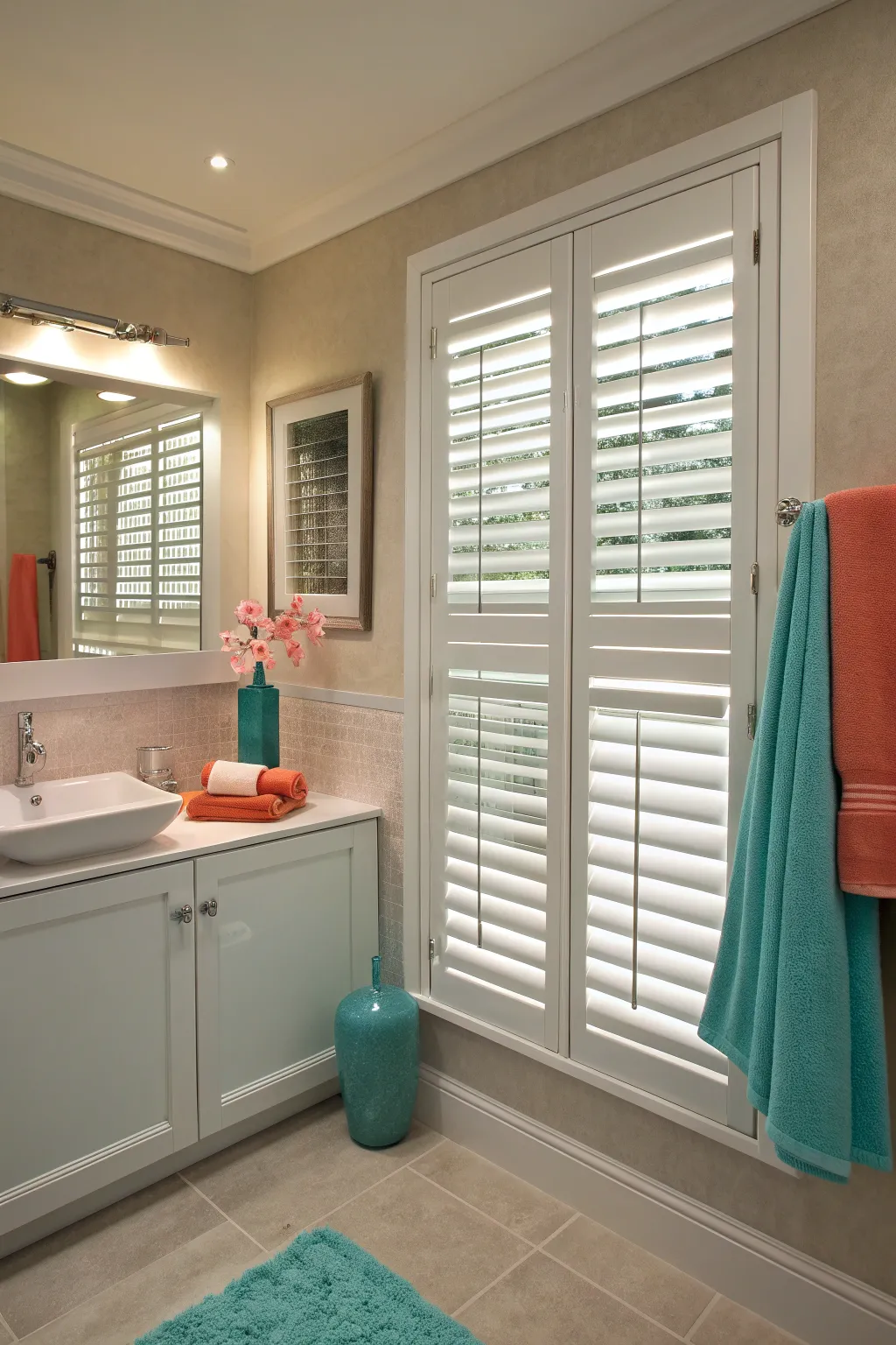 Brighten your bathroom with custom-colored shutters that reflect your personal style.