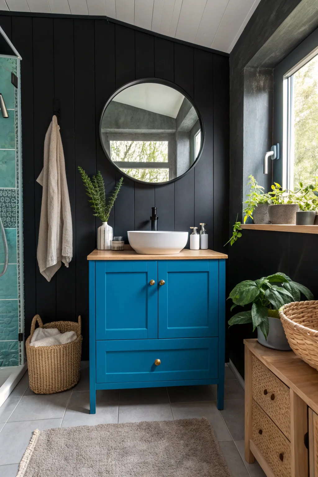 A minimalistic black vanity can serve as a sleek centerpiece in your bathroom. Its clean lines and dark finish create a modern, sophisticated look that complements blue hues.