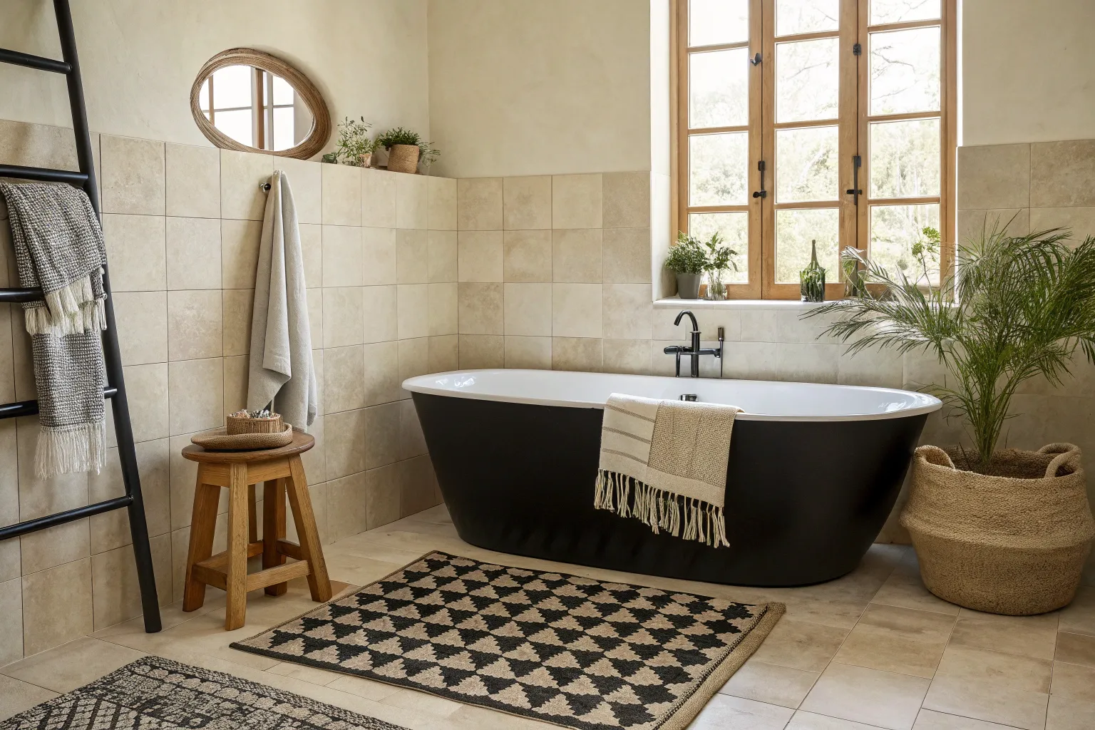 Create depth and coziness with textured elements in your black and cream bathroom.