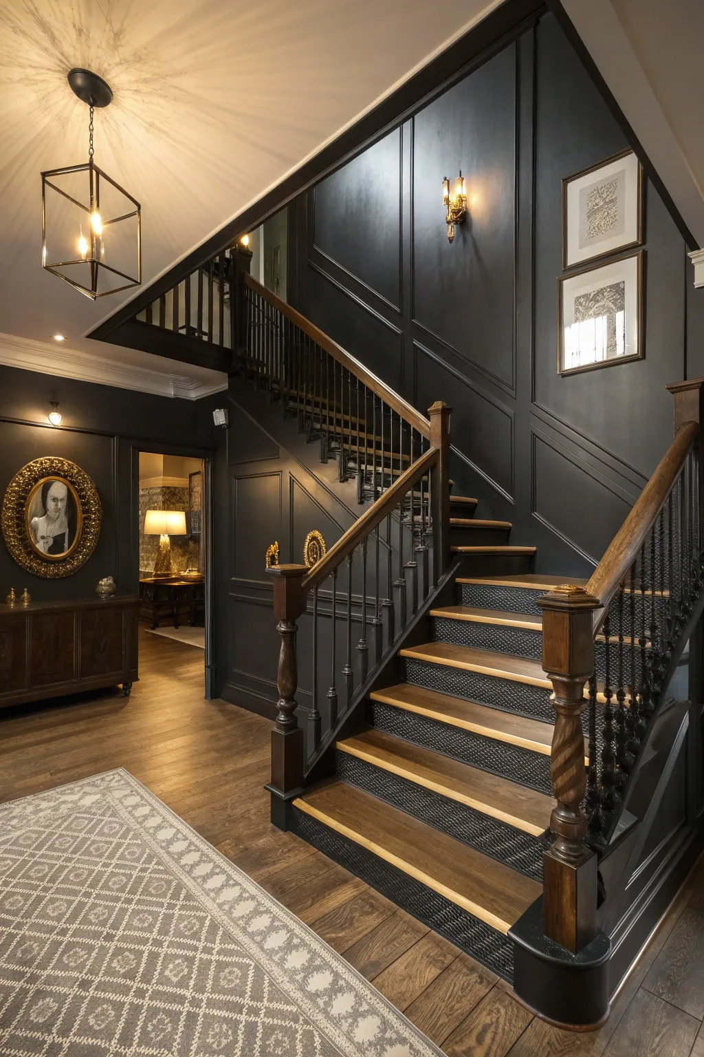 Pair your black stairs with a bold wallpaper on the adjacent wall to create a stunning backdrop. This combination makes a powerful design statement that captures attention.