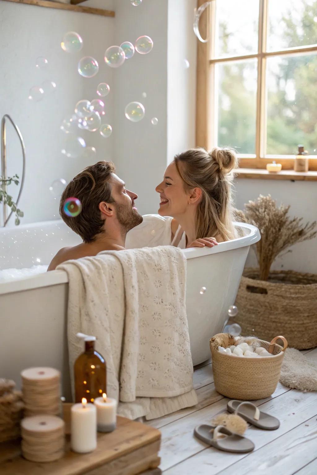 Create a serene setting with a bubble bath and capture the essence of relaxation and intimacy. This idea is both playful and romantic, perfect for unique photos.