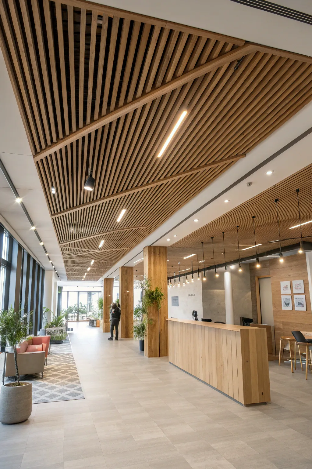 - Slatted Timber Ceiling Panels: Transform your office with elegant timber panels for a sophisticated and modern ceiling look.