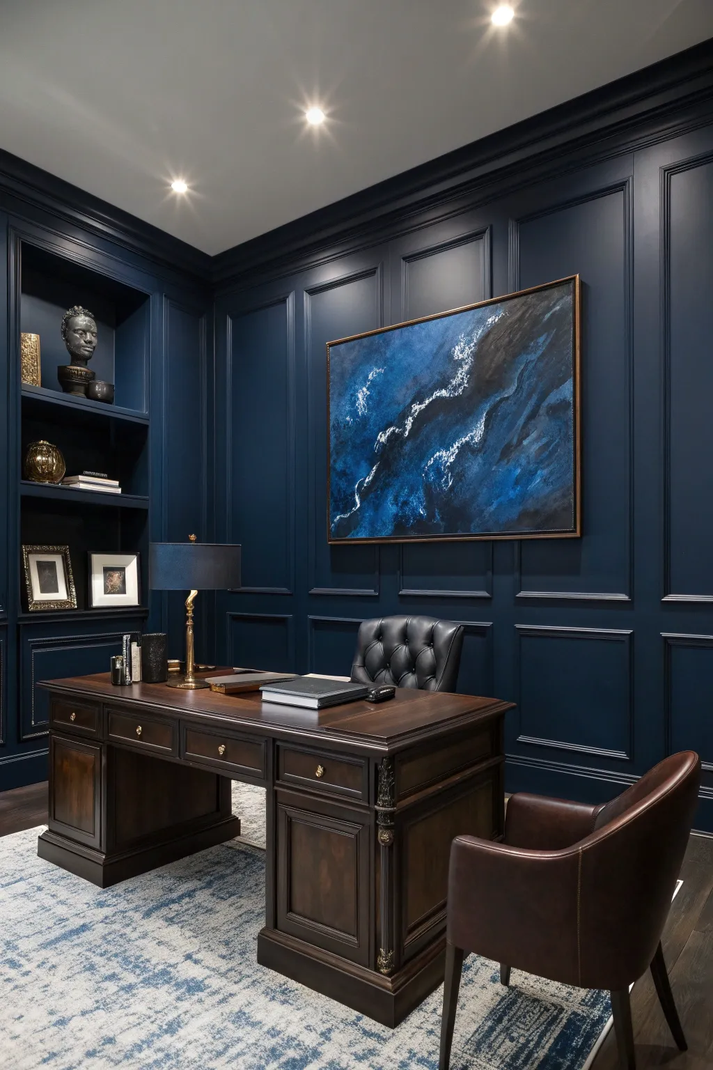 Start by painting your office walls in a deep dark blue for a backdrop that feels both bold and soothing. From my experience, this color adds depth and sophistication, setting the perfect tone for any workspace.