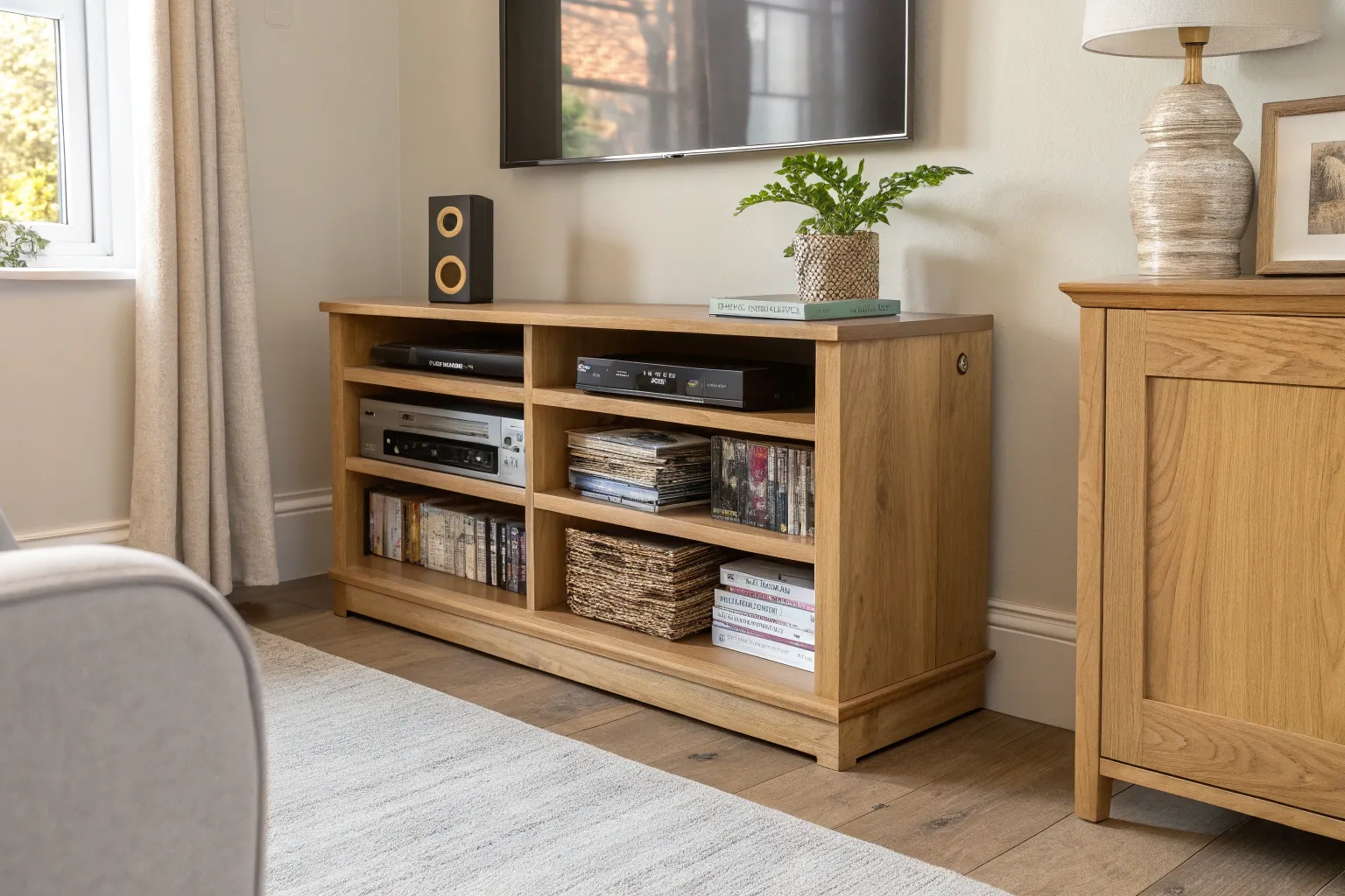- Wooden TV Stand with Storage Shelves: Enhance your living room with a stylish TV stand featuring ample storage for quick DVD access.