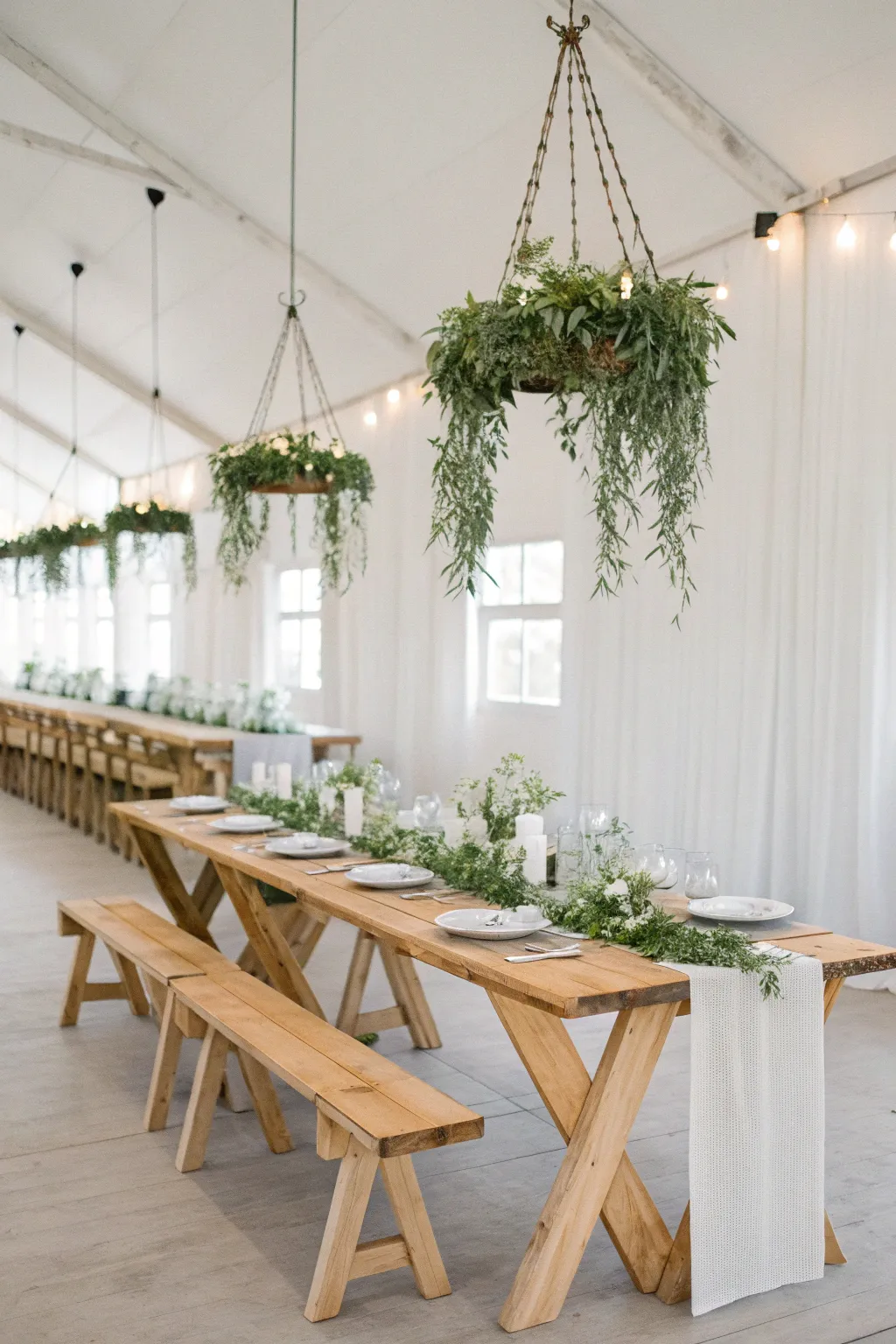 Elegant eucalyptus chandeliers hung overhead create a breathtaking and space-saving decor solution.