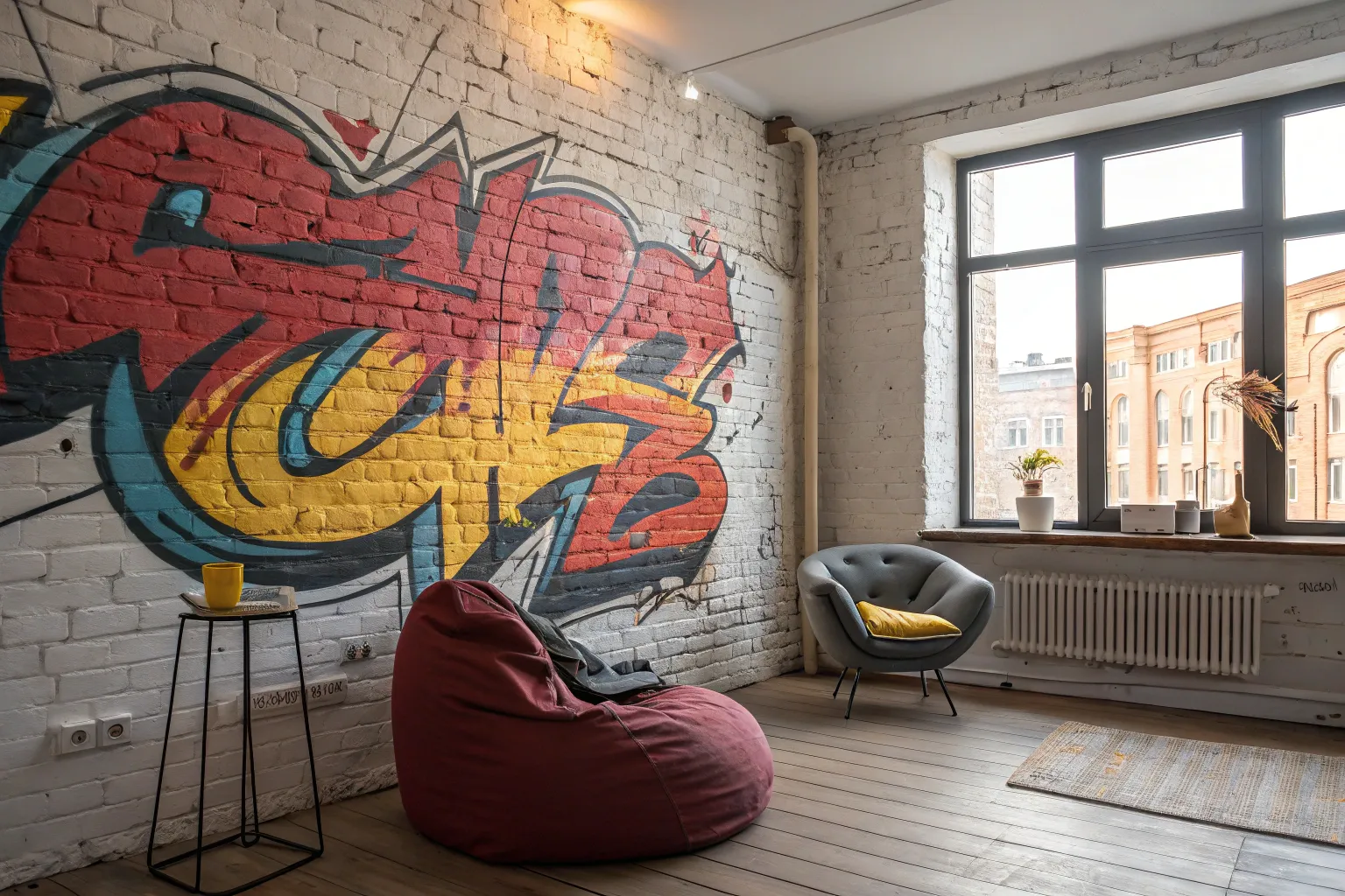 Add a splash of urban flair with a graffiti-inspired rug. This can be an unexpected focal point that ties the room together.