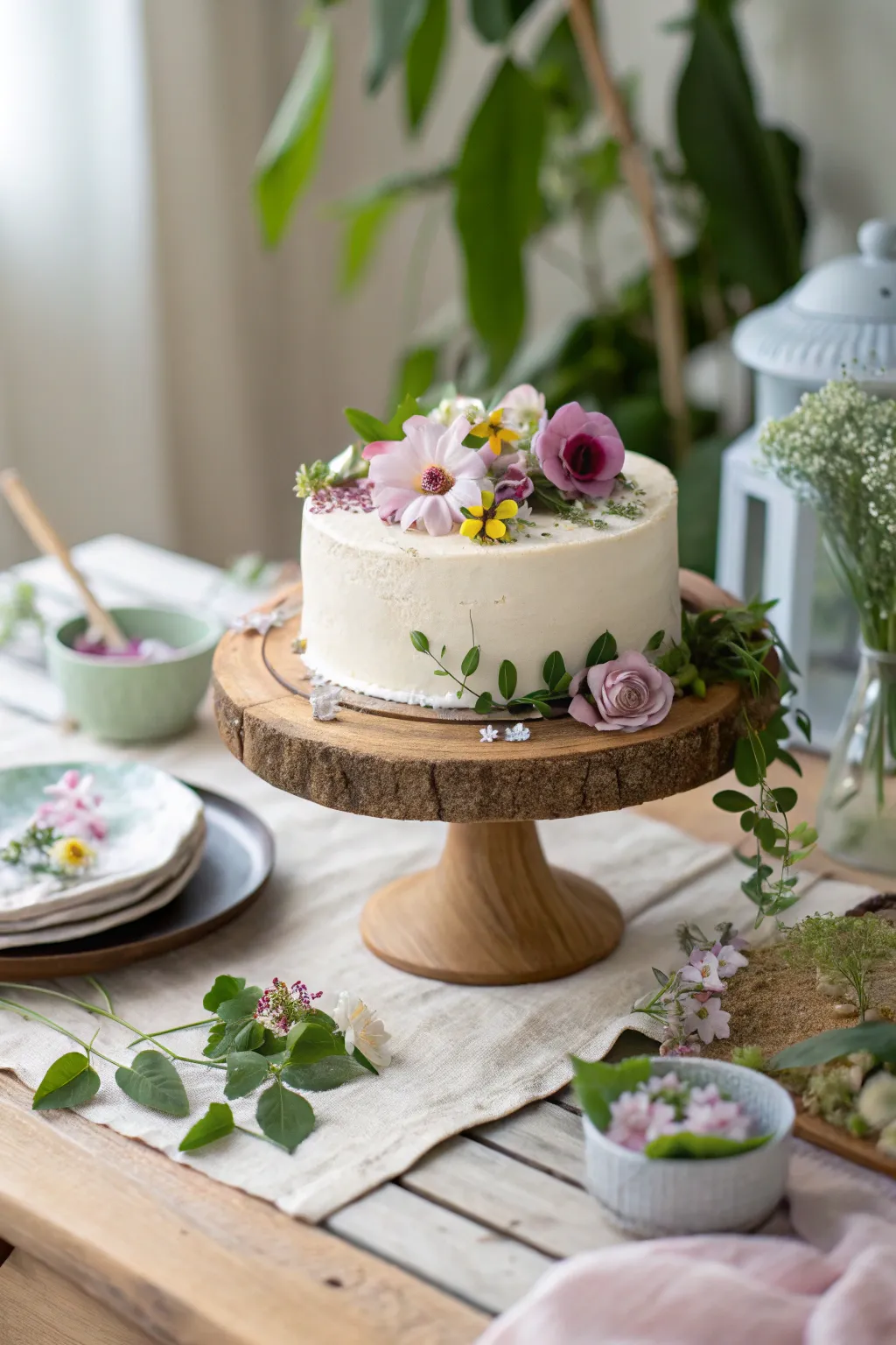 - Wooden Cake Stand: Showcase your cake on a rustic wooden stand for an elegant garden ambiance.
