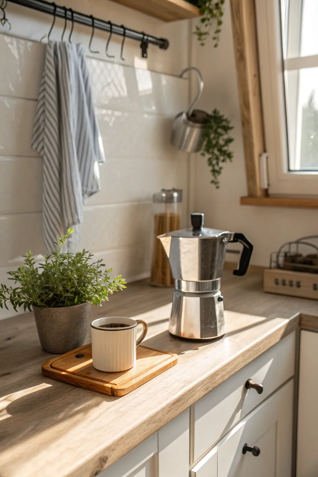 Keep counters clear by using wall shelves or hooks for frequently used items. I’ve found that elevating items off the counter creates a more open feel.