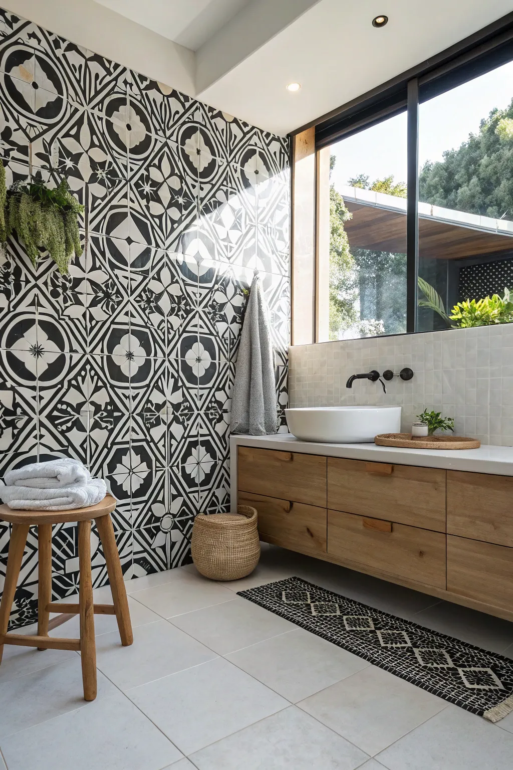 • Black and White Geometric Wall Tile: Elevate your bathroom walls with these striking tiles, adding modern elegance and depth instantly.