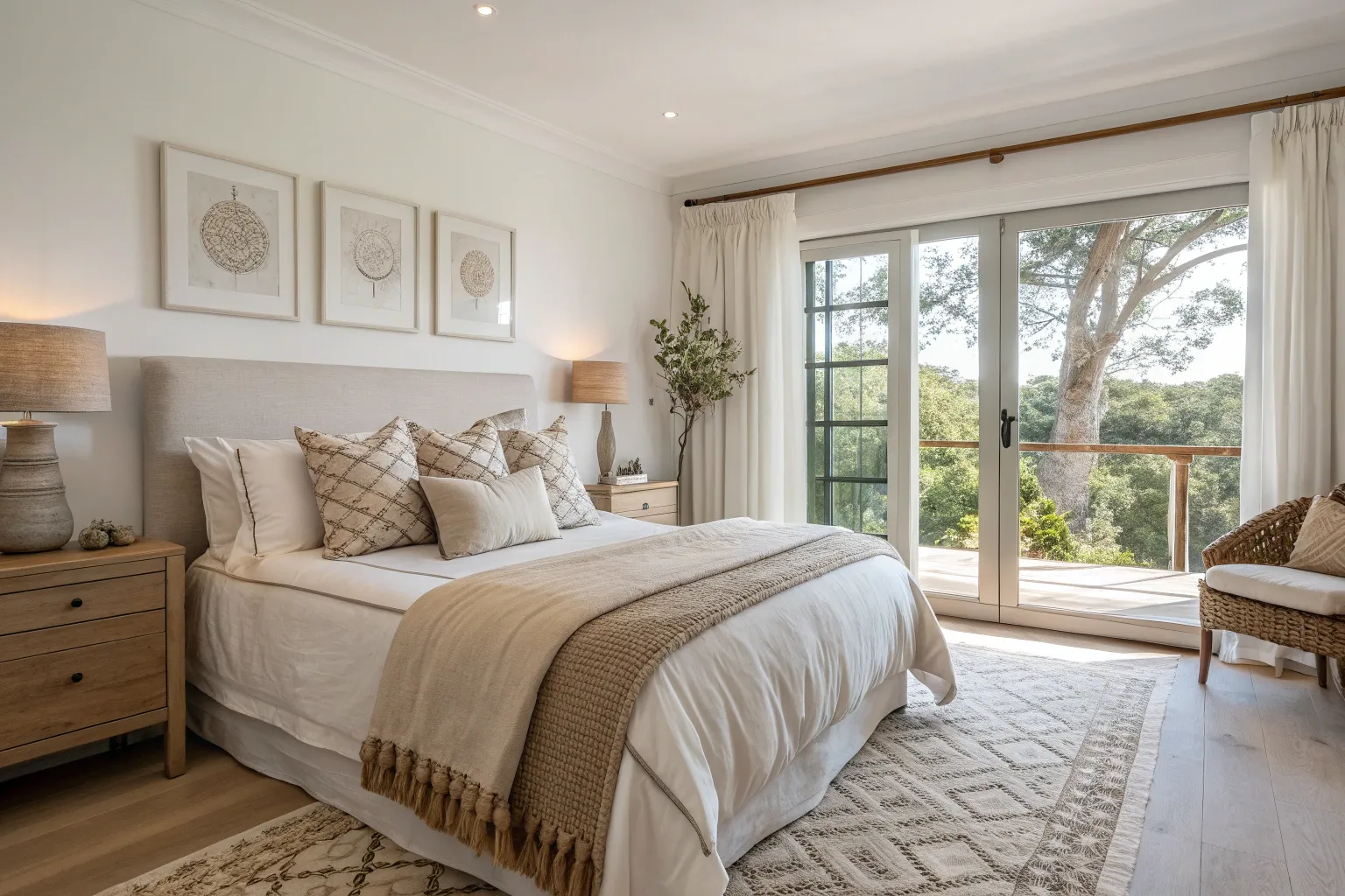 • Neutral Geometric Area Rug: Enhance your bedroom’s coziness with a neutral geometric rug, making spaces warmer and inviting.