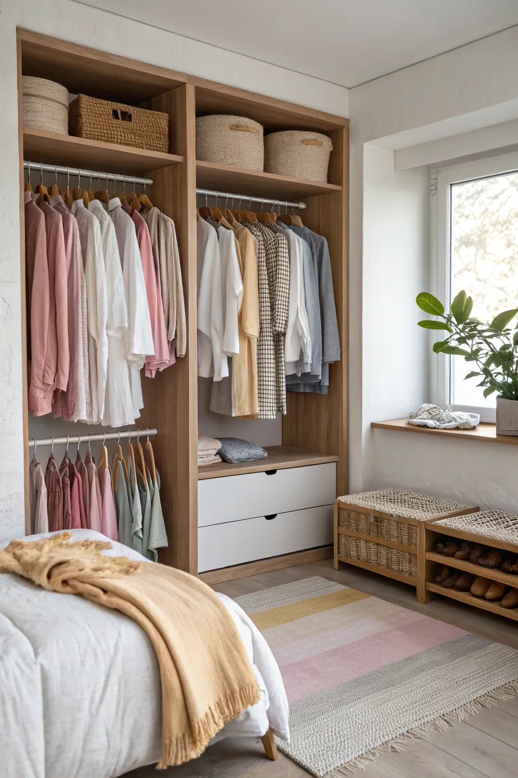 Organize clothes by color for visual harmony. This method not only looks beautiful but also simplifies finding what you need.