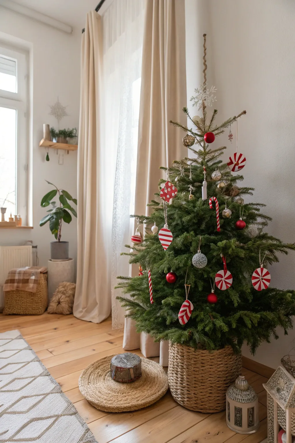 Add peppermint swirl ornaments to your tree for a sweet touch. These eye-catching decorations bring a playful and nostalgic feel to your holiday setup.