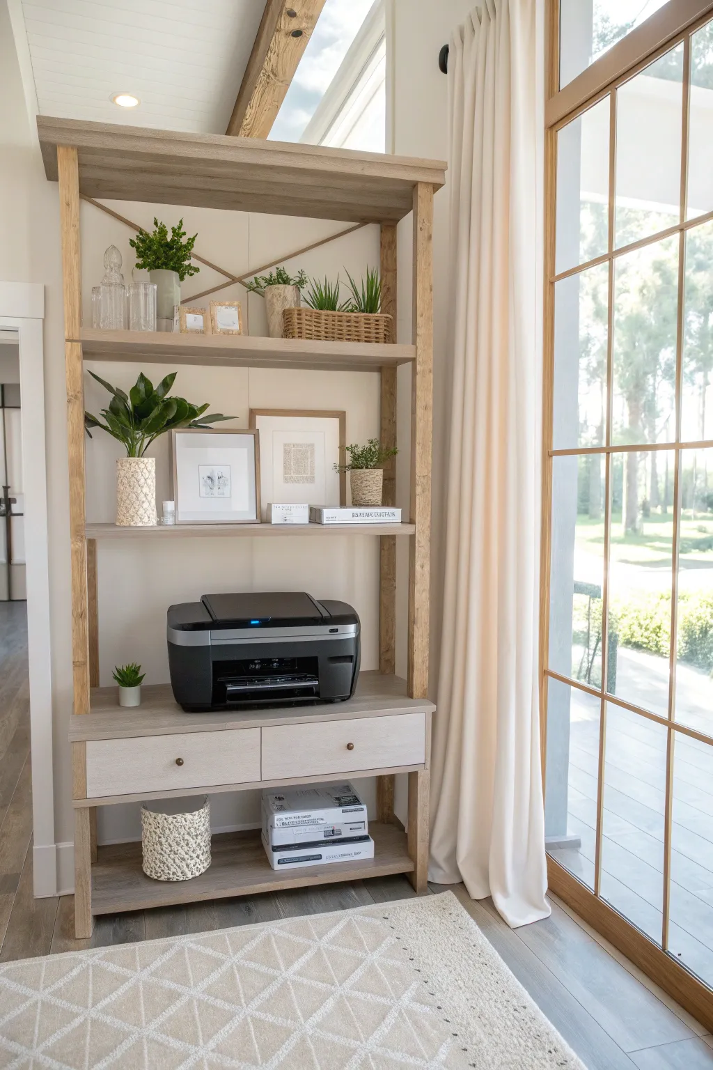 Install a floating shelf to elegantly display your printer. I’ve found this method perfect for keeping the area open and airy while maintaining functionality.