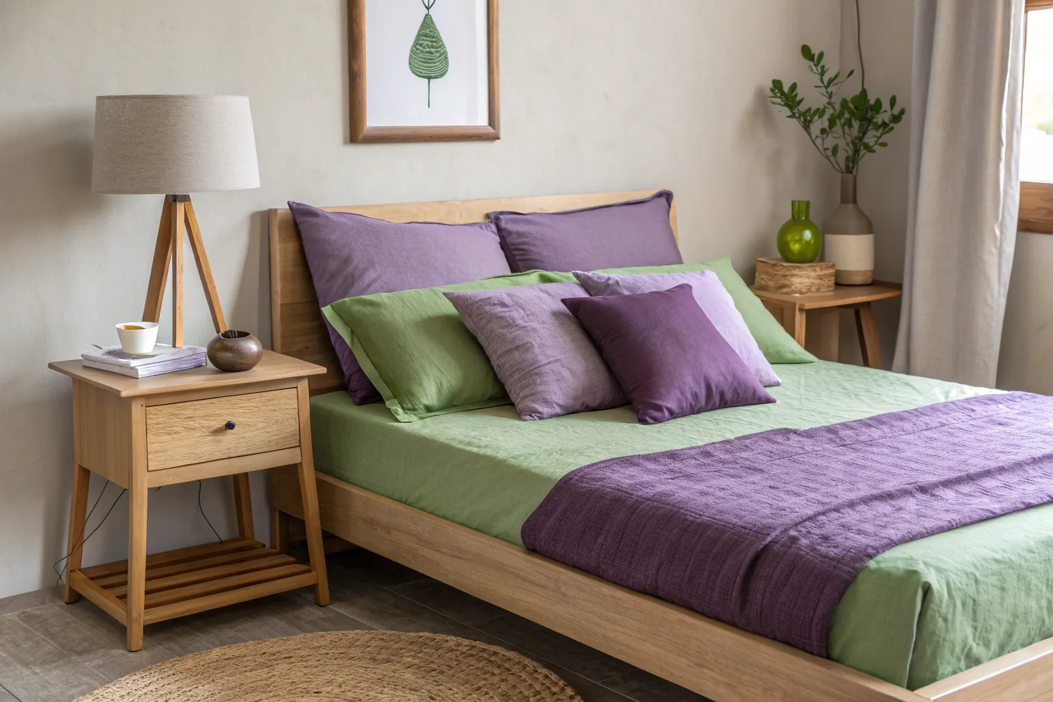 Drape your bed with luxurious bedding in various shades of purple and green. Mixing textures like velvet and cotton can add depth and a cozy feel to your bedroom.