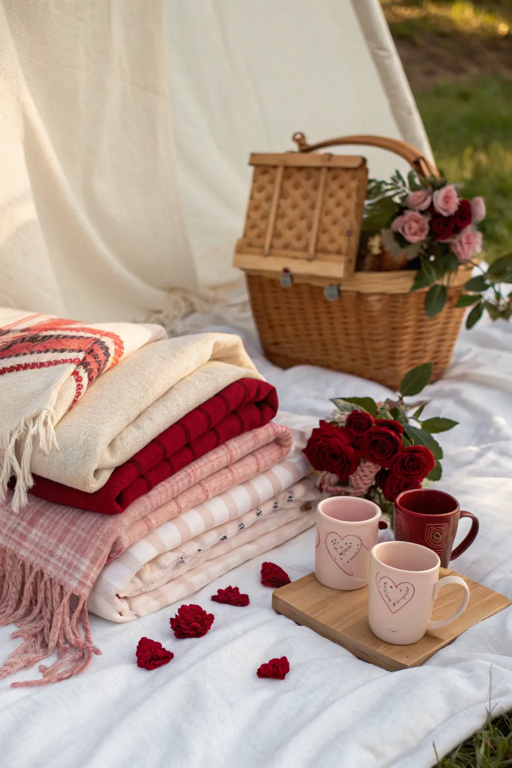 Layer a blanket in shades of red or pink to set the romantic tone. I always bring an extra fluffy throw for added comfort and warmth.