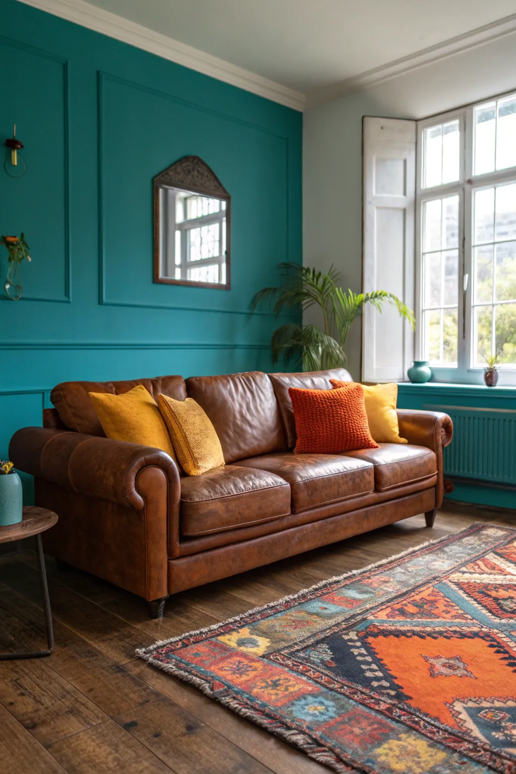 Teal is an unexpected yet stunning color to pair with brown furniture, offering a unique and refreshing twist. It’s a combination that always intrigues my guests in the best way.